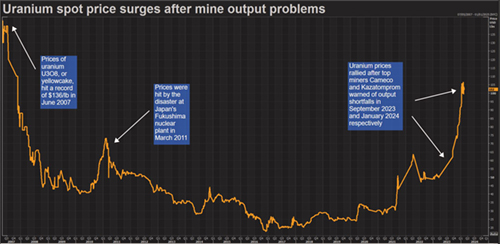 The metal has captured investors' attention after prices doubled over the past year to $102 a pound as top producers Kazatomprom and Cameco cut production guidance because reopened mines that had been mothballed struggled to ramp up production to meet renewed demand.